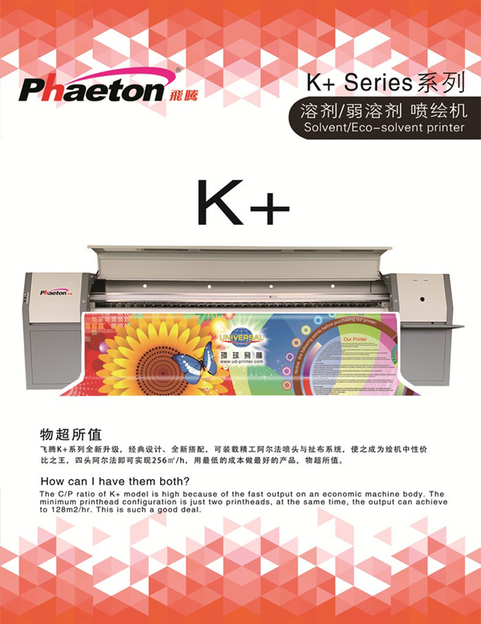 飛騰K+系列全新升級,經(jīng)典設(shè)計、全新搭配,可裝載精工阿爾法噴頭與扯布系統(tǒng),使之成為繪機中性價比之王,四頭阿爾法即可實現(xiàn)256㎡/h,用最低的成本做最好的產(chǎn)品,物超所值。